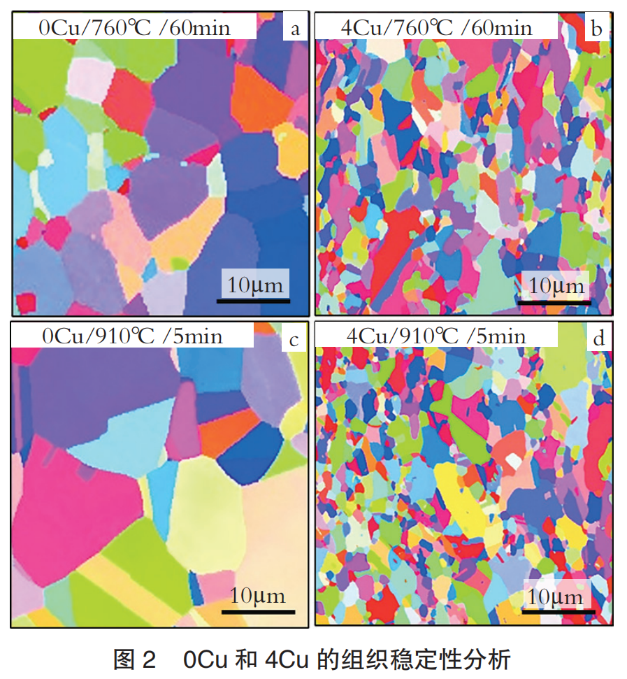 研究人员分别从退火温度和时间两个维度分析了超细晶组织的稳定性。图2a和2b显示,在760℃下保温1h后,4Cu的平均晶粒尺寸仅从5min退火后的0.8µm长大到1.3µm,而0Cu的平均晶粒尺寸从2.1µm增长到了5.7µm。当温度从760℃上升到910℃时,4Cu的平均晶粒尺寸仅从0.8µm长大到1.4µm,超细晶组织极其稳定,而0Cu的平均晶粒尺寸从2.1µm长大到了6.3µm,如图2c和2d所示。以上结果表明,无序共格析出还可以大幅度提高纳米材料、超细晶材料的组织热稳定性。
