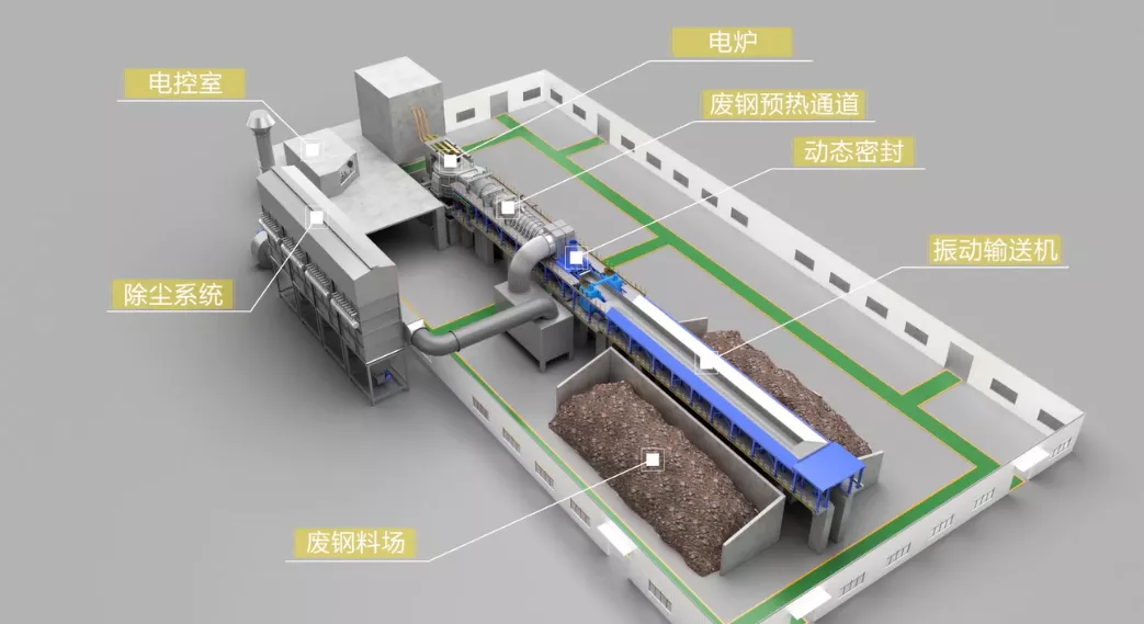 废钢预热连续加料设备由加料段、中间段和预热段三部分组成,预热段的进料端与除尘系统管道联通,出料端与电炉炉壁上的四孔搭接,组成全封闭废钢预热输送、烟气净化、余热回收等连续输送给料、连续预热的连续预热加料系统,同时配备大留钢量的电弧炉组成连续熔化、连续冶炼的整套电炉连续炼钢系统。