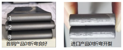 2、传统冷轧复相钢采用“高碳成分+高温退火”获得少量铁素体+贝氏体+马氏体+少量残余奥复相组织。但高温加热及快速冷却容易造成温度不稳定,从而造成材料性能的波动。且高碳复相钢存在带状组织,对折弯要求较高的零件适用性一般,如某国际知名一级配套商用进口材加工某零件时折弯开裂率高达8%,难以满足门槛、滑轨等零件高折弯性能的成形需求。