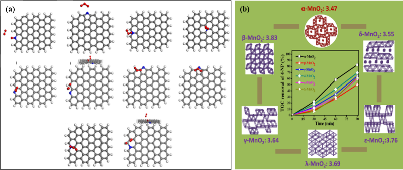 1、针对浓盐水中有机污染物去除率低的难题,结合自由基抑制实验、原位光谱表征和量子化学计算研究,深入揭示了臭氧在催化剂表面线式吸附-内断键的界面活化新机理(如图2所示),指导开发出富氧缺陷的钙钛矿催化剂和耐高盐改性碳催化剂(如图3所示),催化臭氧氧化效率比常规催化剂提高20%以上。浓盐水中有机物去除率>60%,大幅降低后续处理的膜污染问题。