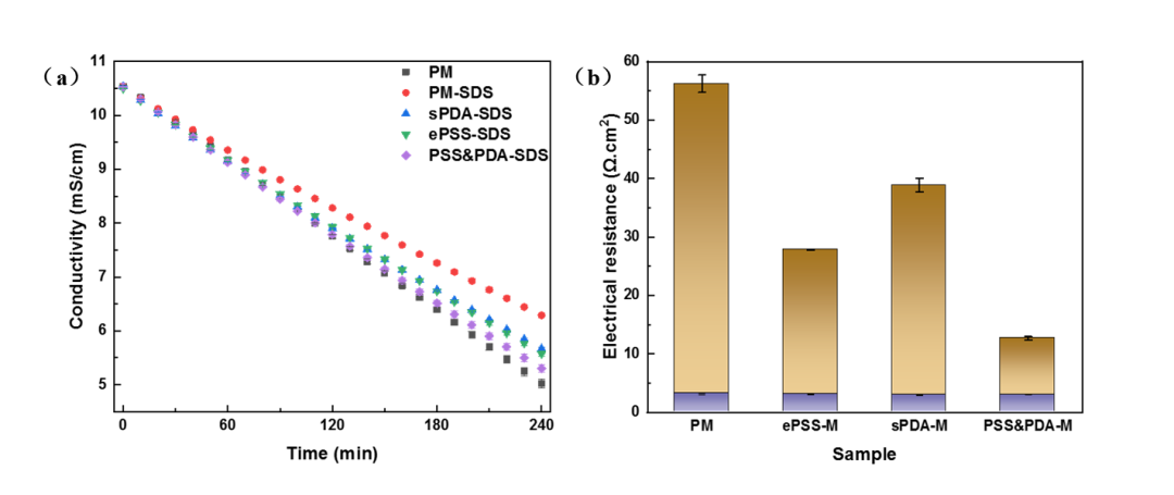 图5不同改性膜处理的淡室溶液电导率及膜面电阻变化情况