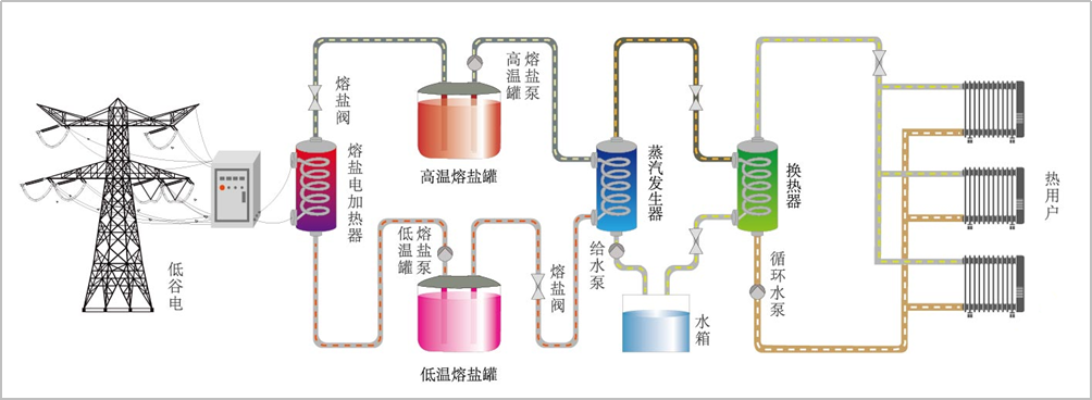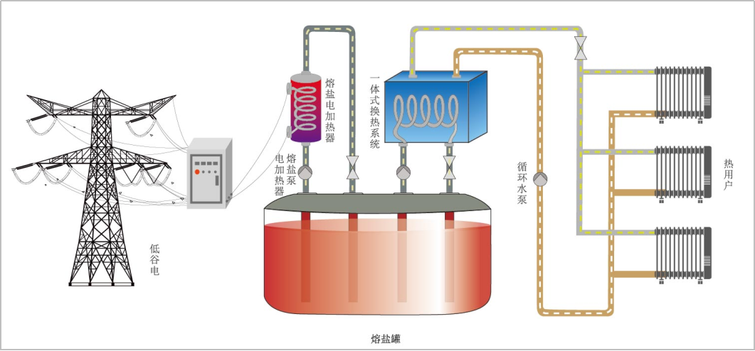 熔盐储热在清洁能源供暖中应用的主要技术路线是双罐熔盐储热和单罐熔盐储热两种,双罐储热供暖系统适用于大型供暖项目,单罐储热供暖系统适用于小型供暖项目。熔盐储热供暖系统在低谷电时通过熔盐电加热器加热熔盐并进行存储,峰电供暖时则通过换热系统将储存的热能传递给水,实现供暖功能。