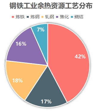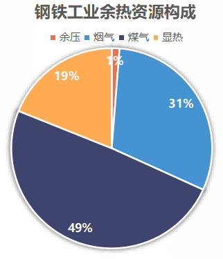 从各个环节余热资源分布来看,每个环节均有余热产生,余热资源种类较为丰富,主要包含余压、烟气、煤气和显热等,主要集中在炼铁、炼钢等工艺环节。炼铁、炼钢工艺环节产生的余热资源占整个钢铁余热资源的60%;各工艺环节中产生的煤气资源占整个钢铁余热资源的50%。储能在钢铁生产一直被应用,煤气系统中的“煤气柜”作为煤气缓冲与储存装置,在系统中可以视为储能设备,这是钢铁工业能源系统中最为重要的蓄能设施;蒸汽系统中,蒸汽蓄能器也是一种重要的蓄能装置。但是目前储能技术的应用仍然比较少,在新的发展形势下,将成熟的熔盐储热系统在钢铁生产中创新应用前景非常广阔。