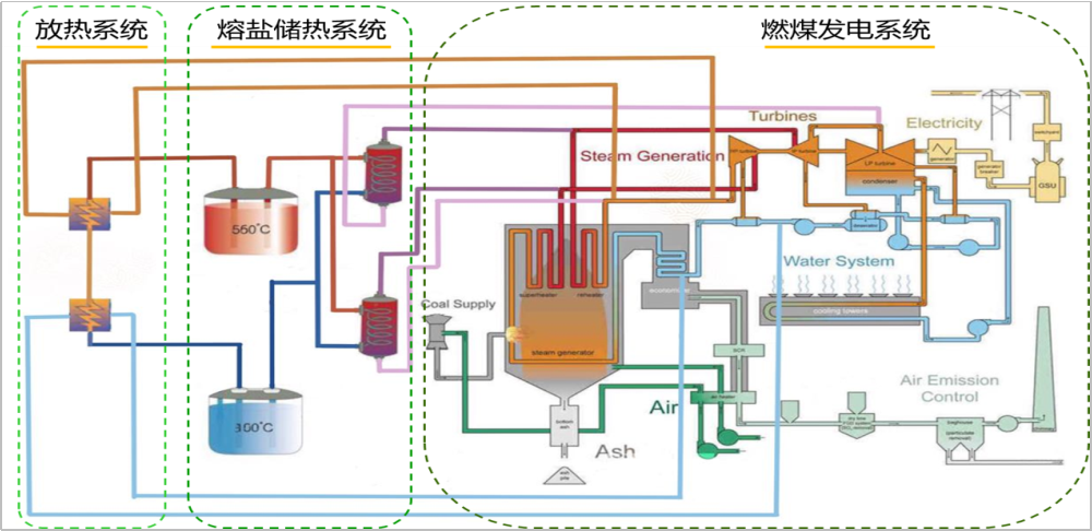 由于供暖温度较低,对于太阳盐的温区应用和防凝的要求较高,因此有研究人员开发出低熔点熔盐,大大减少了熔盐冻堵的风险,降低了防凝运维费用。2016年到2020年,我国各地零星建成了一些熔盐储热供热示范项目,但整体来看,熔盐储热技术在供暖领域大规模的商业化项目寥寥可数,主要是熔盐储热低温供暖的成本与传统能源技术相比仍相对较高。好的一面是2021年以来,在“双碳”目标要求下,终端能源电气化进程的加快,以及对清洁供暖的广泛关注,利用弃风弃光或谷电加热熔盐储热供热技术可以有效转移弃风弃光或富余的低谷电力,提高电网稳定性和电能的使用率,也增加了供热安全保障和品质,又使谷电的价格优势得到了充分发挥,因此在熔盐储热技术的在实现对燃煤燃气锅炉替代方面,越来越受到关注和重视。2.3 熔盐储热在火电灵活性改造中的应用