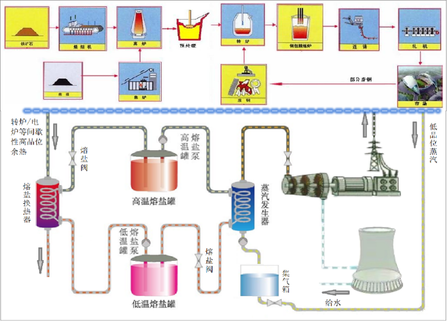 3.2 熔盐储热在低品位蒸汽提质的综合应用目前,冶金企业利用余热产生蒸汽的技术主要有:干熄焦、烧结环冷余热发电、转炉煤气汽化冷却、电炉烟气余执回收和加热炉烟气汽化冷却等。然而,这些余热蒸汽品质普遍较低,且受生产工艺影响,某些蒸汽还具有间歇性和周期性的特点,这不仅限制了蒸汽后续利用,也降低了余热回收效果。如目前炼钢的电炉、转炉等设备,广泛烟道汽化余热锅炉来回收波动性较大的间歇性高温余热。将高温热能转化为低品位的低压饱和蒸汽进行发电,导致余热资源得不到充分利用。因此,利用熔盐将间歇性和周期性的高温余热进行回收并存储,对冶金过程中多点的低品位饱和蒸汽进行过热,或者直接转化为稳定可持续的高温蒸汽,使发电功率和能源利用效率得到大幅提升,改善余热发电系统的经济性,同时提高余热发电系统的灵活性,显著提高经济效益。