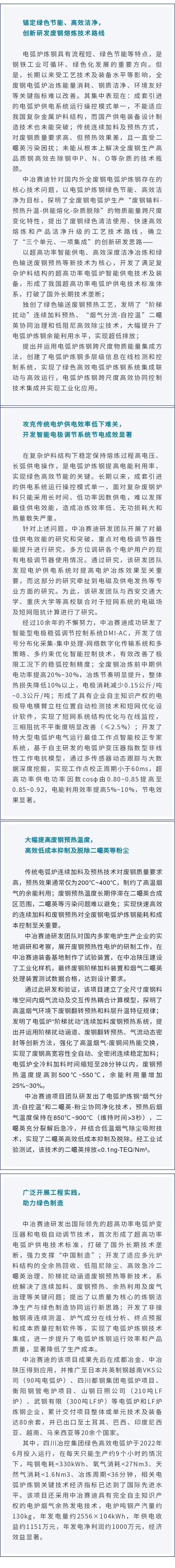 针对国内外全废钢电弧炉在炼钢生产过程中能量消耗高、质量不稳定、二噁英污染等重大关键问题,中冶赛迪历经10余年协同创新,研发了超高功率智能供电、高效深度洁净冶炼、绿色输送废钢预热和高效协同控制集成等绿色高效电弧炉炼钢技术,技术指标达到国际先进水平,在超高功率智能供电和高效深度洁净冶炼方面国际领先,并在国内外广泛推广应用。2020年,中冶赛迪牵头申报的“绿色高效电弧炉炼钢技术与装备的开发应用”项目获得国家科学技术进步奖二等奖。