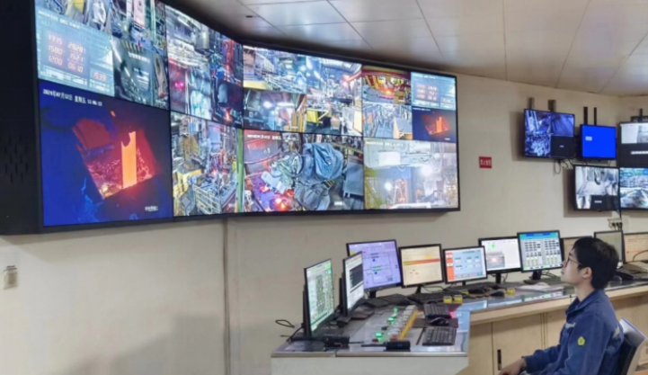 在中南股份4#连铸机集控操作室,记者就被眼前的场景震撼住了,只见宽敞的操作室里挂着巨幅的大屏幕,从大屏幕上,可以清晰地看到浇钢平台的所有设备和每个动作。在大屏幕下,一位操作人员在主控台前监控着整个浇钢过程。操作室里,语音播报的声音清晰回荡,及时提示着浇钢过程的每一个步骤……