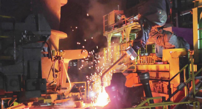 说起钢铁厂,大家脑子里浮现的生产场景就是全副武装的钢铁工人,面对一千多摄氏度高温的钢水挥汗如雨、钢花飞溅……钢铁就是这样炼成的。但在中南钢铁股份有限公司(以下简称中南股份)4#板坯连铸全流程智能一键浇钢平台现场,一切都可颠覆你的想象。这套全流程智能一键浇钢系统真正实现了从钢水上连铸回转台到钢坯生成的全流程一键贯通,整个浇铸过程仅需操作人员在操作室远程监护即可,让工人真正远离高温、恶劣的现场环境,彻底打破了人们对传统连铸浇钢方式的认知。