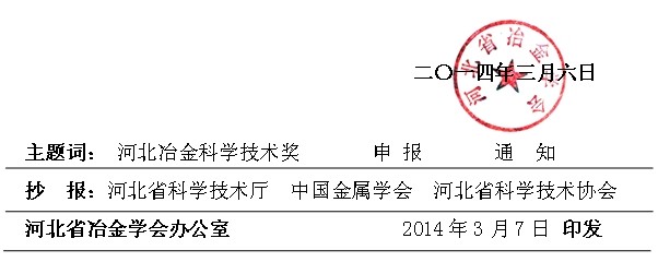 关于申报2014年河北冶金科学技术奖的通知 各有关单位: 2014年河北冶金科学技术奖评审工作按网上申报、受理、网评和总评等阶段进行。为做好2014年河北冶金科学技术奖申报、评审工作,根据《河北冶金科学技术奖奖励暂行办法》和《河北冶金科学技术奖奖励暂行办法实施细则(试行)》的有关规定,现将有关事宜通知如下: 一、奖励重点及申报范围 2014年河北冶金科学技术奖奖励的重点:一是以科技创新促进钢铁行业转型升级。二是加大节能减排技术和二次资源综合利用技术的开发、推广和利用。三是推动钢铁企业降本增效。 2014年河北冶金科学技术奖申报范围是:按照《河北冶金科学技术奖奖励暂行办法实施细则(试行)》规定的奖励范围进行申报。主要包括:基础研究成果、技术发明、应用技术成果、社会公益成果等。 二、申报条件 申报项目限在2011年1月1日至2014年3月31日期间完成,应用时间在一年以上。 三、申报程序 申报系统分为在线网上申报和离线客户端申报两个版本,如果条件允许,建议使用在线网上申报版本。 1、在线网上申报版本使用说明 (1)①登录河北省金属学会网,网址:http://www.hbsyjxh.org点击《河北冶金科学技术奖奖励网上申报系统》(以下简称《申报系统》),或直接在IE地址栏中输入网址:http://221.192.236.163/hbsyjxh/shangbao/login.asp ②点击下载《河北冶金科学技术奖推荐书》填写说明(简称《填写说明》)和《河北冶金科学技术奖奖励网上申报系统》使用说明(简称《使用说明》)。 (2)进入登录页面,按照提示,输入相关信息,注册账户。在“用户类型”栏目选择“完成单位”,登录成功(详见使用说明),将申报材料通过网上提交。申报材料附件须通过hbyjkjj123@163.com邮箱提交,并将书面申报材料报送省冶金学会,书面推荐书须加盖申报单位公章。 2、离线客户端申报版本使用说明 (1)使用下发的光盘安装客户端使用程序。 (2)按照操作说明,填写相应的内容,将导出的文件上传到网上申报系统中,申报材料附件须通过hbyjkjj123@163.com邮箱提交,具体操作步骤可参见光盘中的使用说明。并将书面申报材料报送河北省金属学会,书面推荐书须加盖申报单位公章。 四、报送申报材料要求 1、申报材料包括电子版推荐书和书面推荐书两部分,应确保推荐书电子数据和书面材料内容完全一致。如不一致,视为无效,取消参评资格。 2、各申报单位负责将书面推荐书2套(含全红章一套,复印件一套)报送河北省金属学会。 3、推荐书的书面材料(主件及附件)打印后,一律用线绳装订,不得另加封面。 4、全红章材料要求编写页码,在附件前需增加附件目录。 5、报奖材料一律不退,请各单位做好存档工作。 五、申报截止时间 1、为了保证网上申报工作顺利进行,请申报单位按照要求做好申报工作,网上申报工作截止时间为2014年4月8日。 2、申报项目推荐书的书面材料务于2014年4月10日以前报送河北省金属学会办公室,逾期不予受理。 六、其它事项 1、为便于专家网上评审,保证申报材料及时、准确地传送到网上,电子版推荐书必须由《申报系统》提交;电子版附件上报到学会邮箱:hbyjkjj123@163.com ,其中图片格式为JPG格式、论文格式为PDF格式,相关要求详见《填写说明》。用扫描仪扫描的图片文件,要求一页对应一个文件,不得多页扫描成一个文件。 2、申报过程中遇到的具体问题请与学会办公室或河北大学丛老师联系,或直接发送到上报邮箱。 联系电话: 0311— 80720250 80720252 联系人: 朱广文 13931891333 郭殿玉 13931871288 技术支持: 丛先生 13731281800 (河北大学)