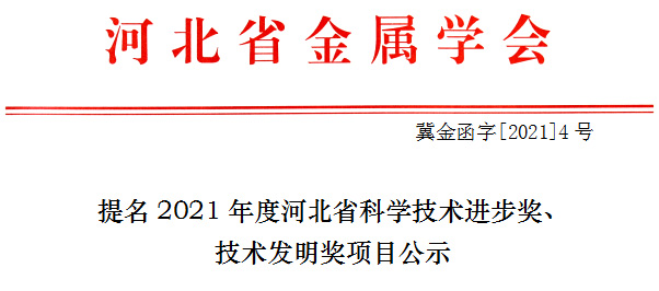 现将提名2021年度河北省科学技术进步奖、技术发明奖等5个项目公示如下: 一、 公示内容 1、 科学技术进步奖(4项) ① 提名号:239—401 高拉速薄板坯连铸生产高品质钢关键技术 ② 提名号:239—402 高纯钒材料绿色制造技术及产业化 ③ 提名号:239—403 基于煤焦矿协同利用的高炉高效低成本冶炼技术研究与实践 ④ 提名号:239—404 钢厂含锌粉尘火湿联合一体化多金属高值化梯级利用关键技术及应用 2、技术发明奖(1项) 提名号:239—301 高性能细晶粒齿轮钢控制技术及创新 二、公示说明 1、公示自2021年6月7日起至2021年6月14日止,在河北省金属学会网站发布。网址:http://www.hbsyjxh.org/。可直接点击提名项目查看(附:提名项目公示内容)。 2、对公示内容有异议者,可在公示截止日前向河北省金属学会提交书面意见,逾期不予受理。 3、公示联系人:梁 玫、胡连菊 联系电话:15613360136 13191856018