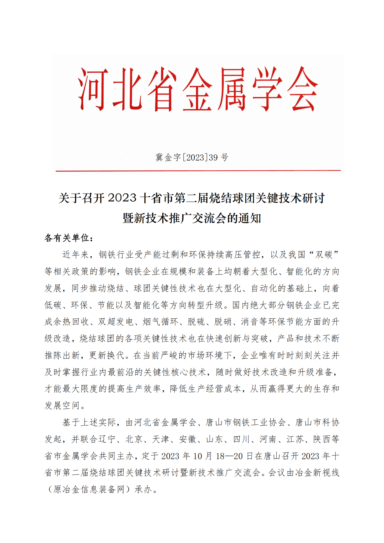 冀金字[2023]039号十省市第二届烧结球团关键技术研讨暨新技术推广交流会的通知